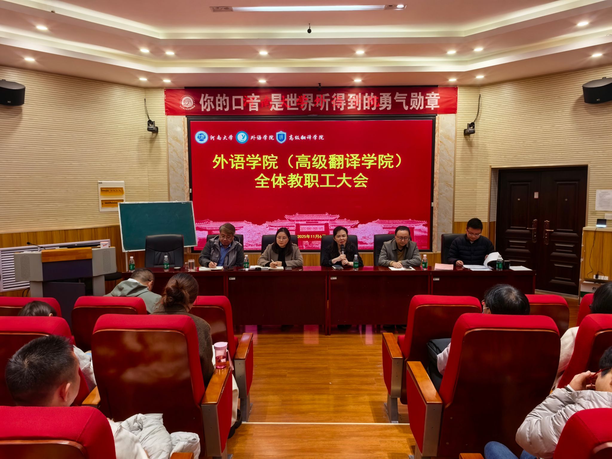 2025年11月6日下午,外语学院(高级翻译学院)秋季学期第二次全体教职工大会在外语北楼五厅召开。学院领导班子成员及全体教职工参会。学院党委书记王玉珍主持会议。