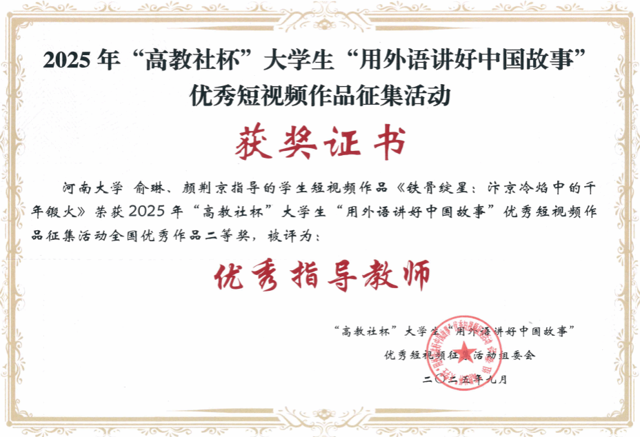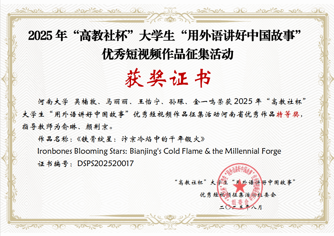 喜报|外语学院(高级翻译学院)学子荣... 外语学院(高级翻译学院)召开秋季学期... 外语学院(高级翻译学院)召开第四期中... 情暖重阳,爱在西湖|外语学院(高级翻... 白云登高志更壮 ——河南大学广东校友会... 河南大学通识课《意大利文化》跨学科团... 外语学院(高级翻译学院)2025级新生集... 河南大学外语学院(高级翻译学院)举办 ... 外语学院(高级翻译学院)召开党委(扩... 外语学院(高级翻译学院)召开第三期中...喜报|外语学院(高级翻译学院)学子荣获2025年“高教社杯” 大学生“用外语讲好中国故事”短视频全国二等奖